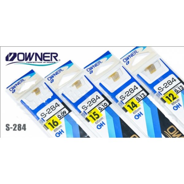 Серия поводков Owner/C'ultiva S-284 предназначена для ловли белой рыбы поплавочными и донными снастями. Длина поводка составляет 65 см, отсутствие петельки позволяет регулировать ее прямо на месте ловли. Размеры крючков Owner внутри серии изменяются от 16 до 6 номера по международной классификации. Соответственно размеру крючка изменяется и диаметр поводка (от 0.09 до 0.18 мм). И если самые маленькие крючки на тонкой леске предназначены для ловли мелкой рыбы, то крупные крючки с прочной леской легко справятся и с трофейными экземплярами. Крючки этой серии имеют стойкое золотое покрытие.