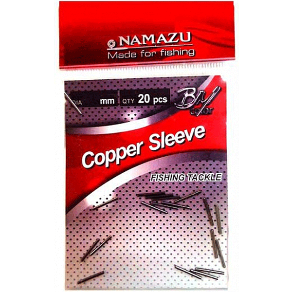 Бренд Namazu предлагает такую полезную деталь оснастки, как обжимные трубочки. Они помогают избежать вязания лишних узлов на леске и тем самым предотвращают потерю ее прочности. Здесь представлена линейка Namazu Copper Sleeve. Она включает обжимные трубочки из меди разных диаметров.